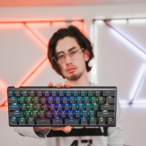 TKO: Compact 60% hotswap mechanical keyboard with dual-zone RGB, split spacebar, and built in tenting and tilting.Learn More